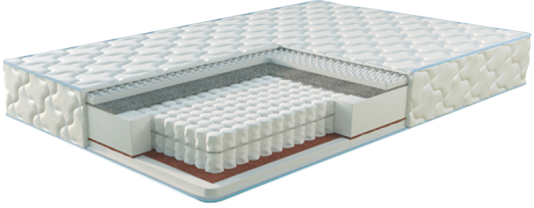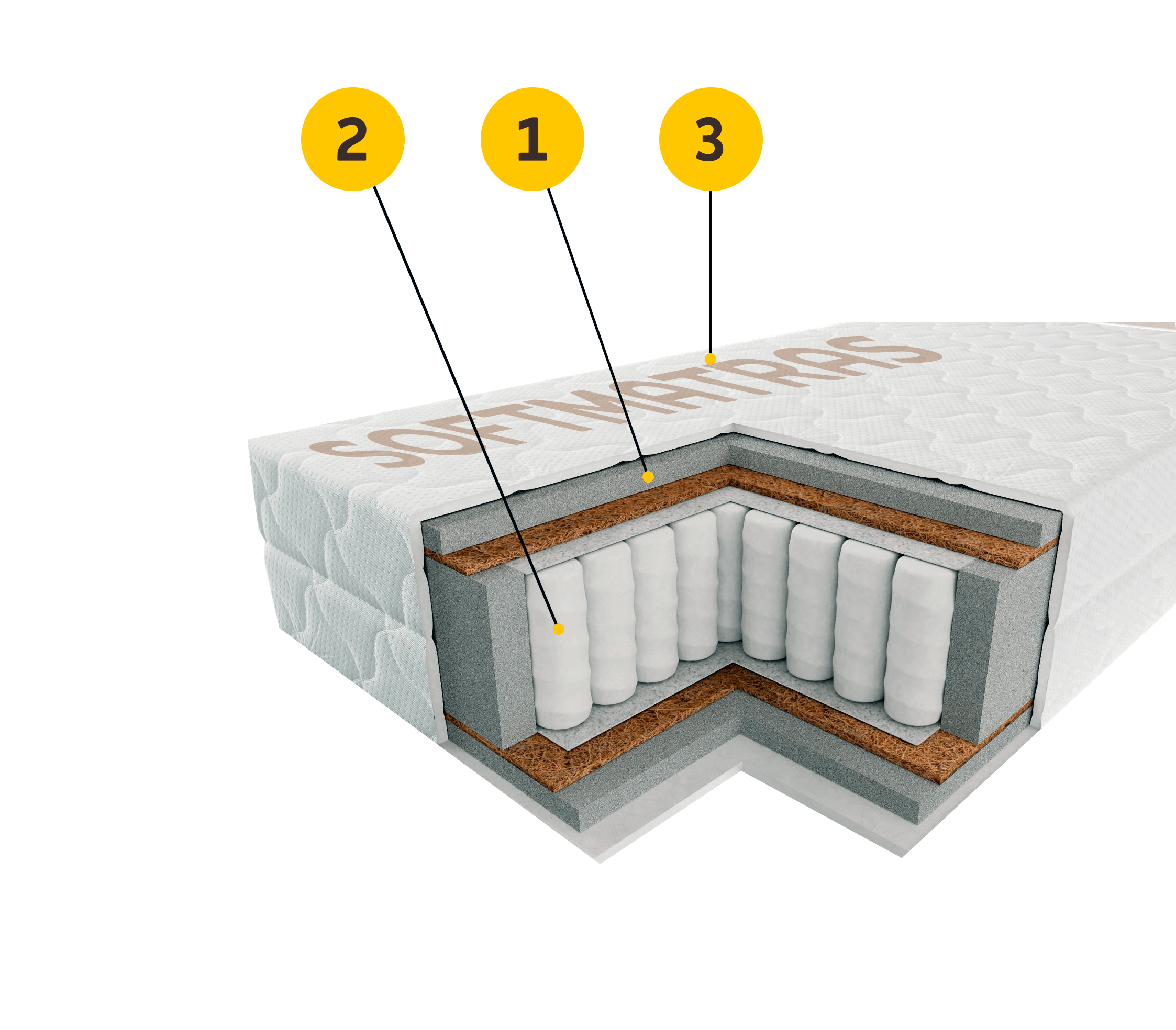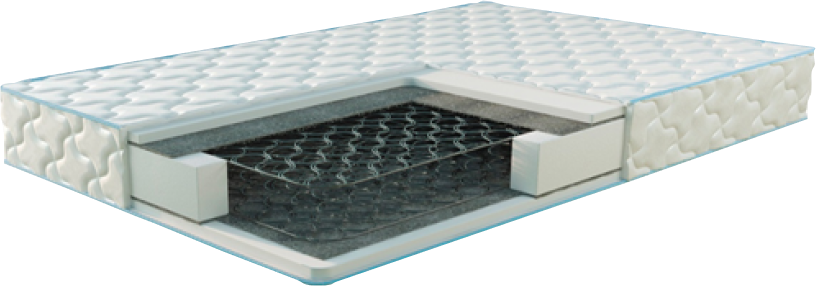 С одной стороны проложен слой кокосовой койры. Кокос делает поверхность упругой и усиливает ортопедичность пружин. Натуральный материал не деформируется со временем и долго служит. По периметру конструкция усилена блоками ППУ – они защищают края от проседания.