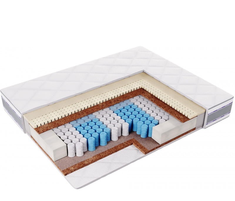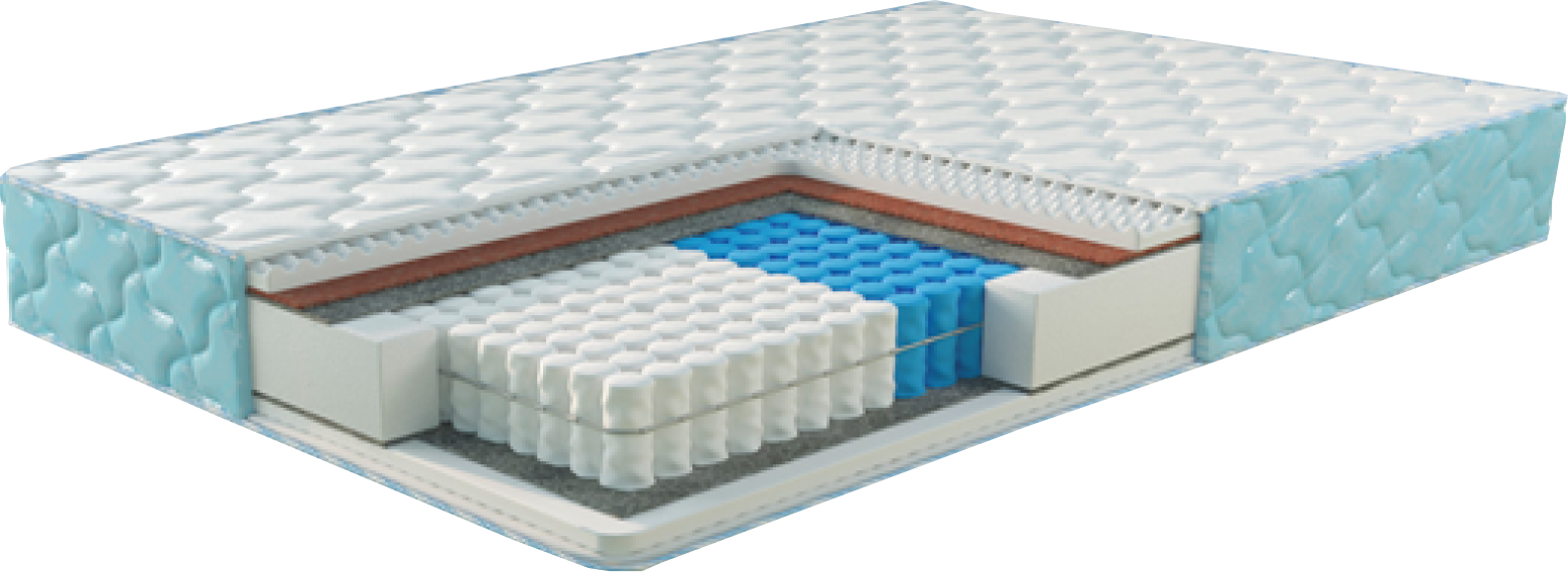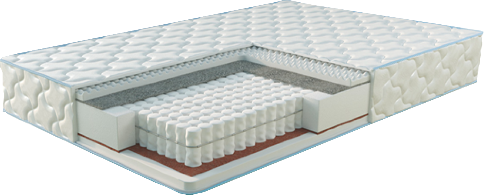 С одной стороны проложен слой кокосовой койры. Кокос делает поверхность упругой и усиливает ортопедичность пружин. Натуральный материал не деформируется со временем и долго служит. По периметру конструкция усилена блоками ППУ – они защищают края от проседания.